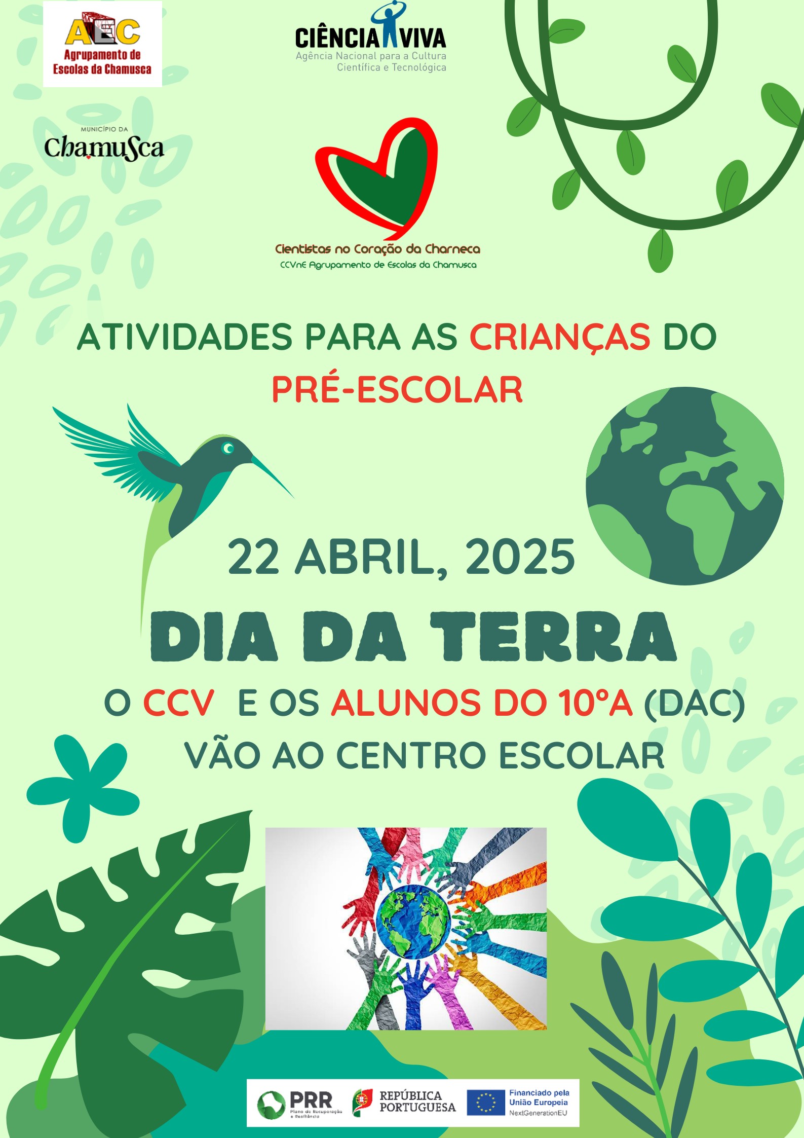 No âmbito do Dia da Terra, do CCV e dos DAC/Cidadania e Desenvolvimento, os alunos da turma A do 10º ano vão dinamizar atividades, no Centro Escolar, no dia 22 de abril, para as turmas do Pré-Escolar. Também vão participar/apoiar os alunos do 12ºA de Biologia e CCV.